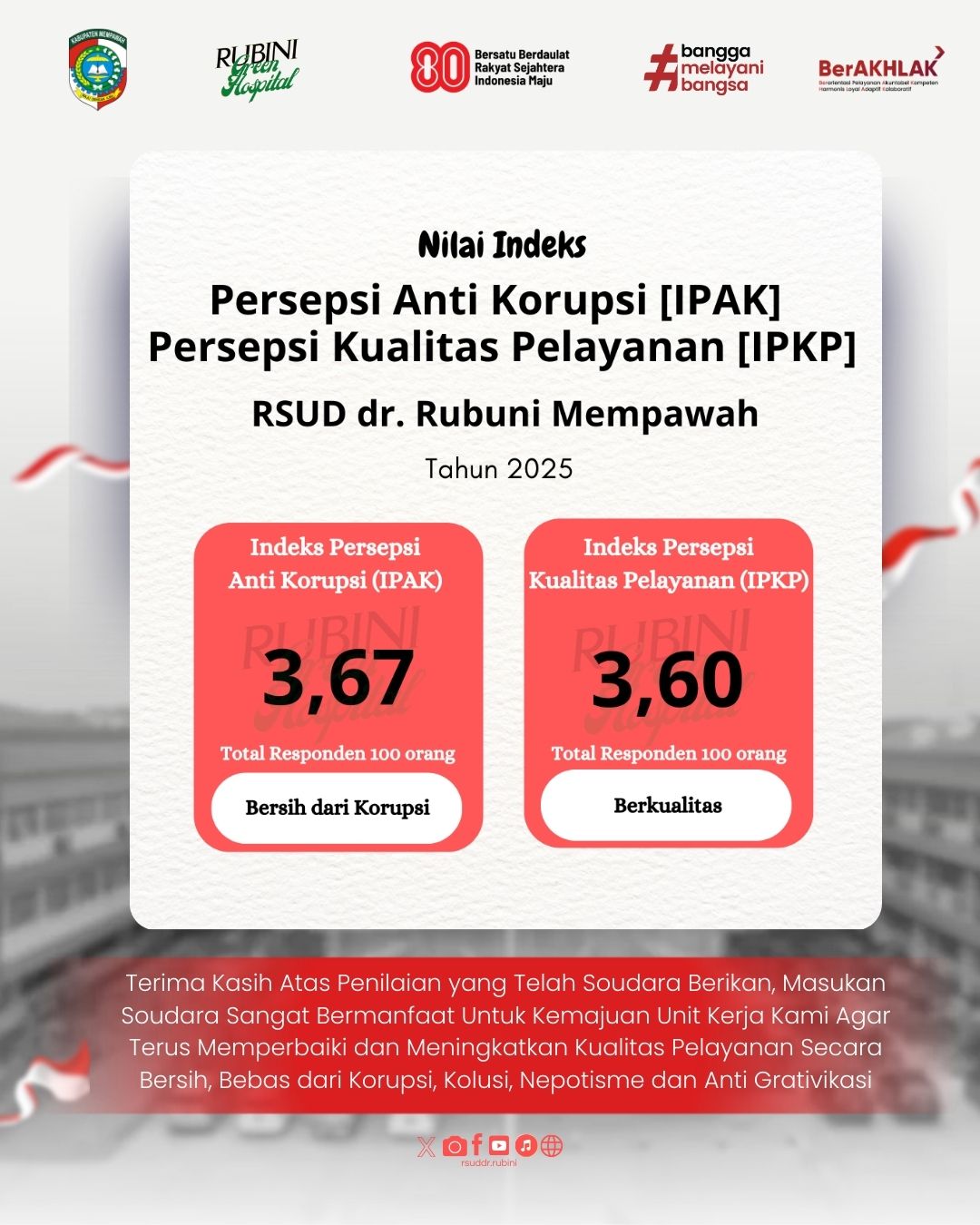 Sebagai bentuk nyata komitmen untuk memperkuat dan meningkatkan kualitas pelayanan publik rumah sakit RSUD dr. Rubini menggelar acara pencanangan pembangunan Zona Integritas dan penandatanganan komitmen bersama dalam rangka menuju Wilayah Bebas Korupsi (WBK). Acara ini merupakan tindak lanjut dari Permenpan no 90 Tahun 2021 tentang pembangunan Zona Integritas menuju wilayah bebas dari korupsi. Di ruang Aula RSUD. Senin 23/09/2024.