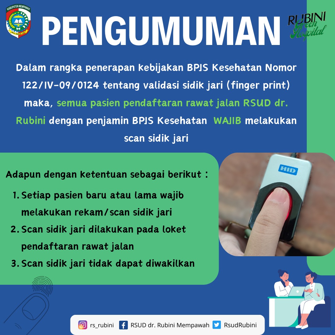 RSUD dr. Rubini telah melaksanakan uji coba rekam sidik jari pada pasien BPJS di semua pelayanan Poliklinik Rawat Jalan secara bertahap. untuk selanjutnya mulai 01 Maret 2024 semua pasien BPJS Rawat Jalan wajib untuk melakukan finger print sebelum mencetak SEP. (Surat Eligibilitas Peserta).