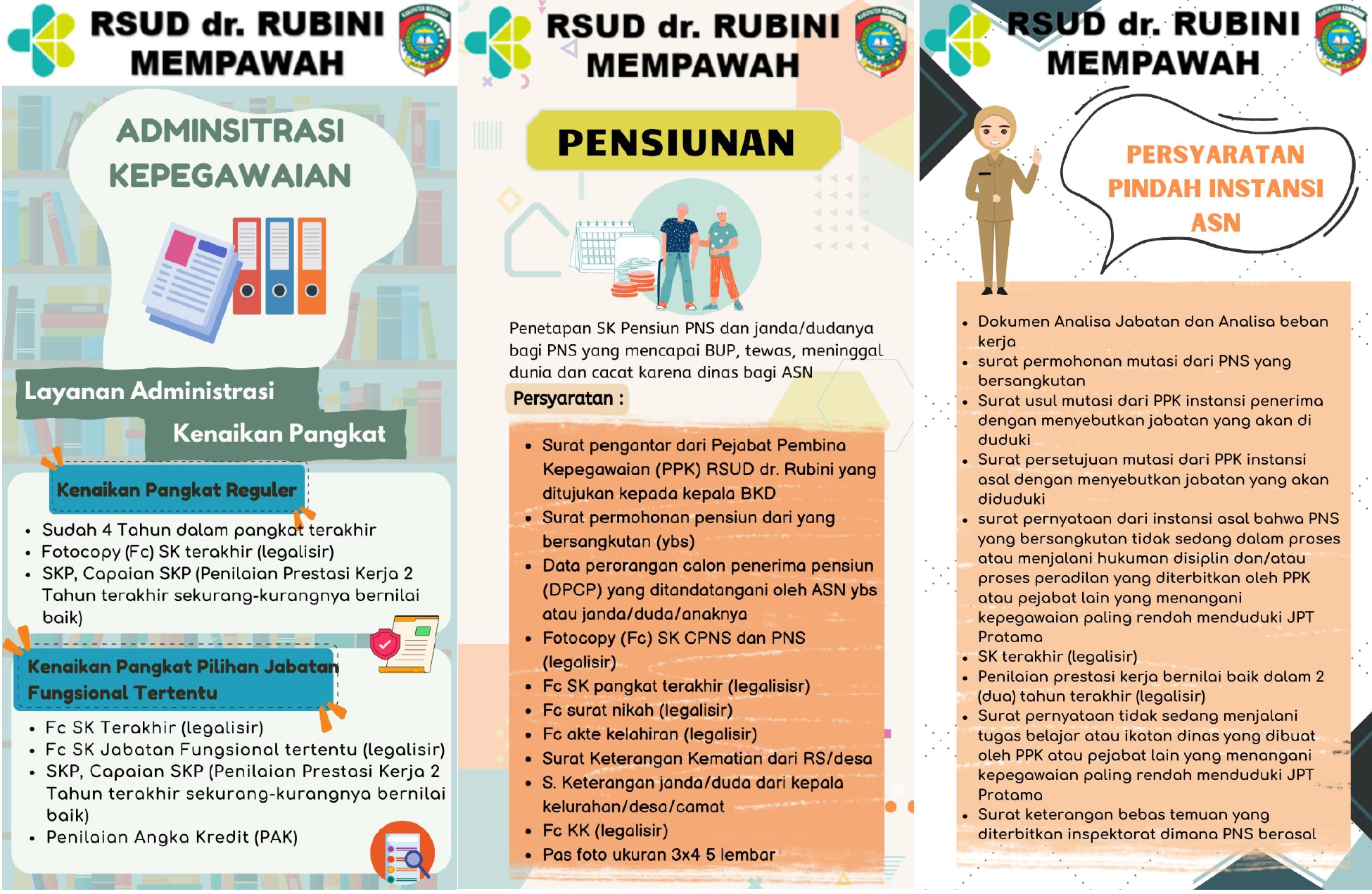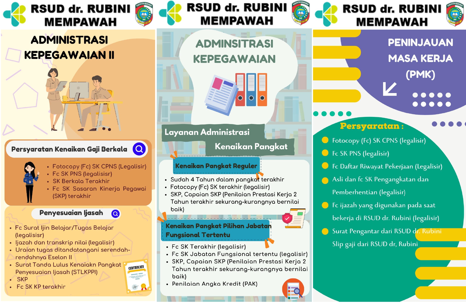 Penyediaan data administrasi kepegawaian merupakan salah satu upaya pemerintah untuk meningkatkan kemudahan pelayanan pegawai. Selama ini penanganan data pegawai dilaksanakan oleh Bagian Tata Usaha dalam hal ini Sub. Bagian Kepegawaian RSUD dr. Rubini Mempawah masih secara manual belum secara digitalisasi. Adanya permasalahan yang timbul ketika memberikan pelayanan kepada pegawai yaitu proses pencarian data/dokumen kepegawaian menjadi lama dan rentan kehilangan, keterlambatan dalam Kenaikan Pangkat (KP), Kenaikan Gaji berkala (KGB), Keterlambatan kenaikan Jabatan Fungsional, Usulan Tugas Belajar dan lain sebagainya yang menunjukkan bahwa pengelolaan data kepegawaian belum berjalan optimal. Hal tersebut lebih banyak disebabkan karena pengananan yang masih dilakukan secara manual sehingga perencanaan yang sinkron sulit dilakukan.